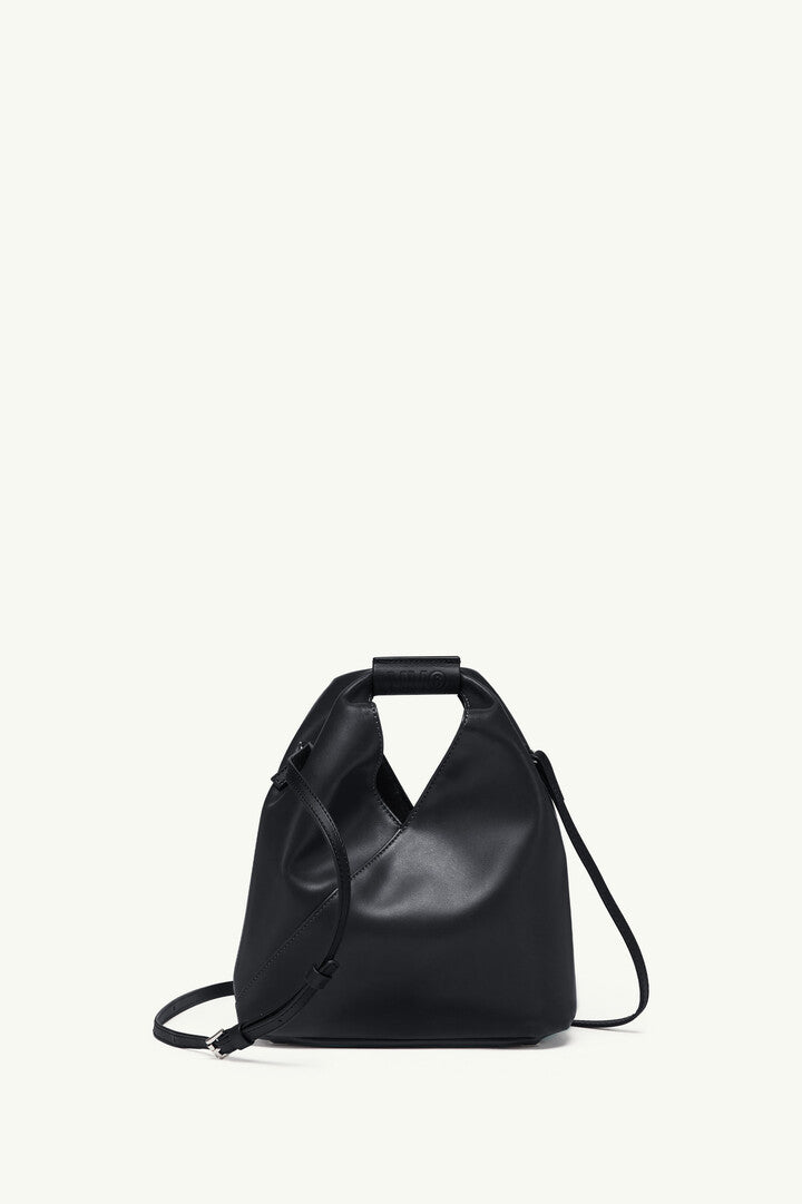 Borsa giapponese in simil-nappa. Introdotta per la prima volta nella collezione Autunno-Inverno 2009, la Japanese Bag è diventata l'accessorio più emblematico di MM6. La caratteristica silhouette triangolare si ispira alla tradizionale tecnica giapponese dell'origami. I bottoni ai bordi consentono di cambiare forma alla borsa piegandola in modi diversi, un richiamo al codice estetico decostruzionista della Maison. La Japanese Bag viene reinterpretata ogni stagione con dimensioni nuove e tessuti innovativi, rendendo l'accessorio intramontabile.